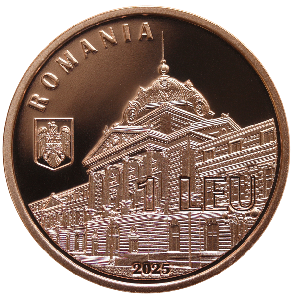 Avers: prezintă o parte a clădirii Spitalului Colțea, inscripția „ROMANIA” în arc de cerc, stema României, valoarea nominală „1 LEU” și anul de emisiune „2025”.