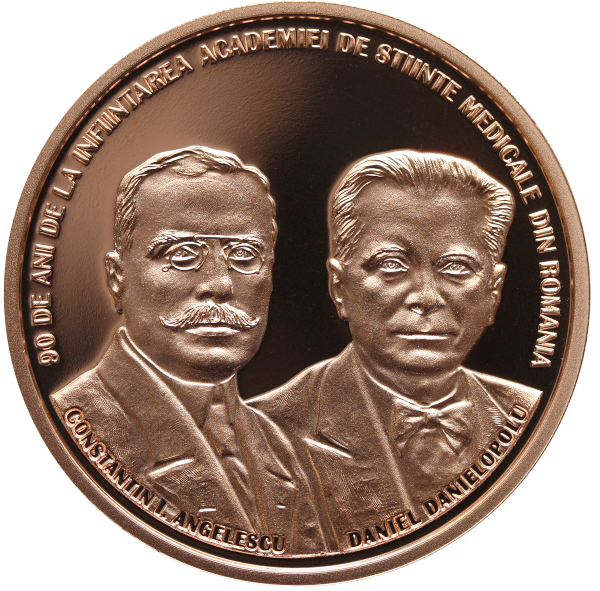 Revers: redă portretele și numele doctorilor Constantin I. Angelescu și Daniel Danielopolu și inscripția „90 DE ANI DE LA INFIINTAREA ACADEMIEI DE STIINTE MEDICALE DIN ROMANIA”.